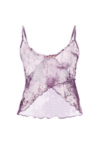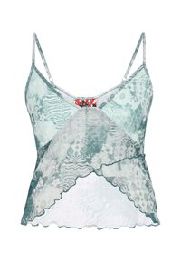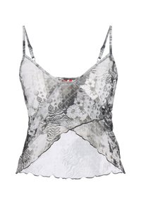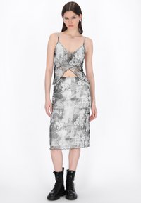 Jonge vrouw met lang donker haar, zilveren creolen en een mouwloze jurk met een patroon in grijs en wit, met dunne bandjes.