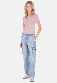 Jonge vrouw met golvend blond haar, met een pastel multicolor shirt met korte mouwen en ritssluiting en lichtblauwe spijkerbroek, handen in de zakken.