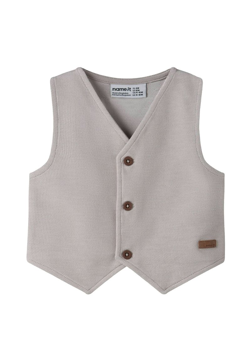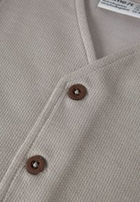 Grijze gebreide spencer met een V-hals, drie bruine knopen en een gestikt bruin label. Heeft een gestructureerde stof en een puntige zoom.