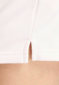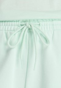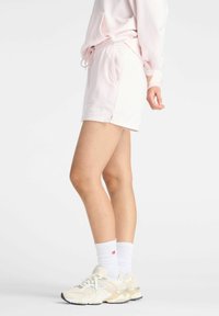 Lichtroze short met trekkoord en zijzakken, gedragen door een persoon met één hand in de zak, met een zachte stof en een elastische tailleband.