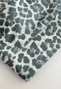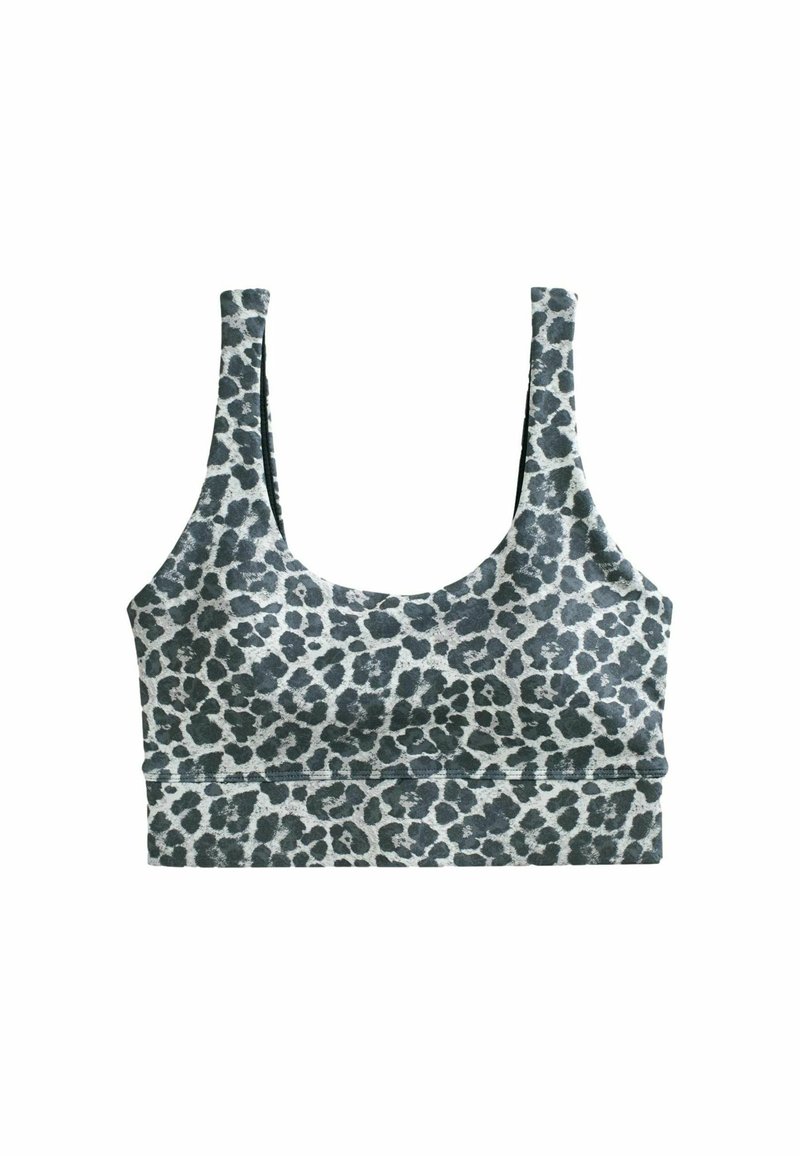 Sportbeha met grijs-zwart luipaardprintpatroon, brede schouderbanden en een ronde halslijn.