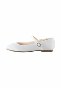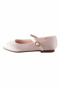Roze glinsterende Mary Jane platte schoen met gouden ovale gesp en lage bruine zool, zijaanzicht.