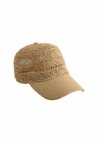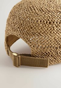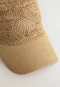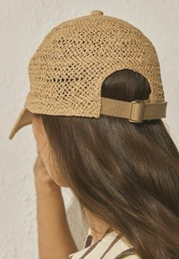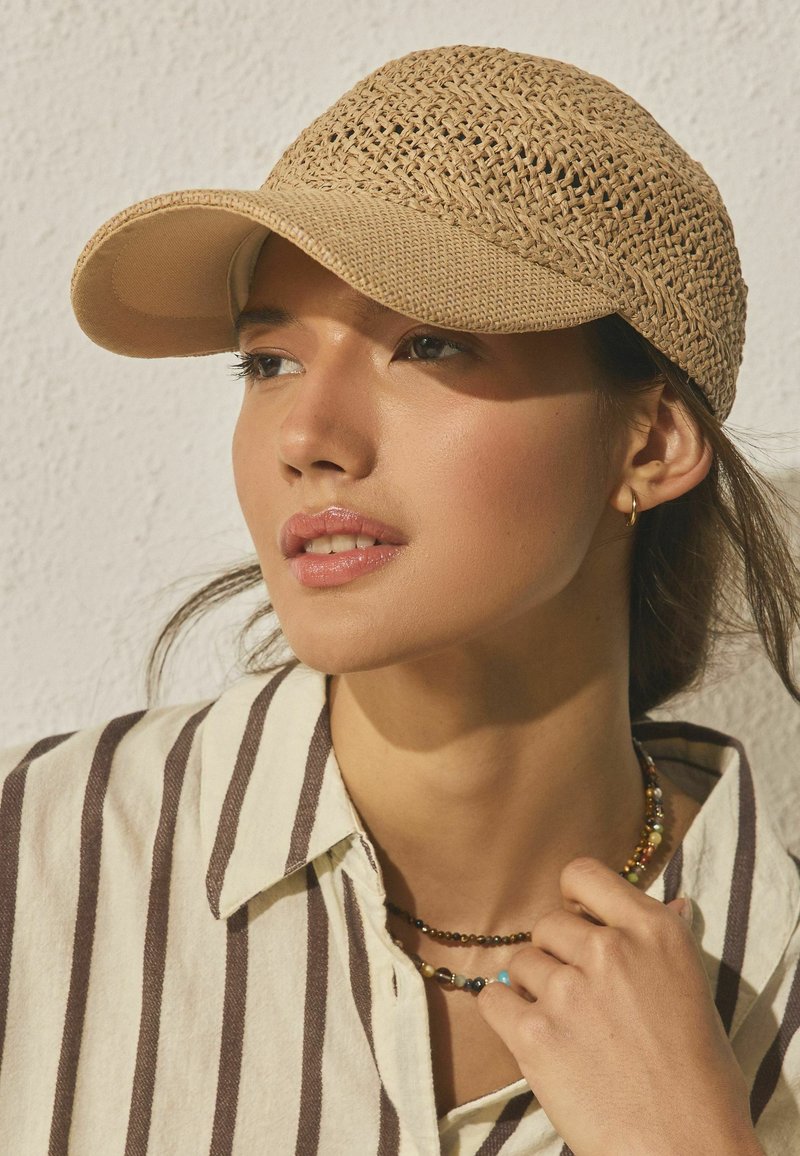 Jonge vrouw met een beige gevlochten pet, gestreept shirt en kleurrijke kralenkettingen, kijkt iets opzij tegen een lichte gehaakte muur.