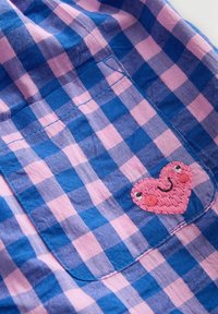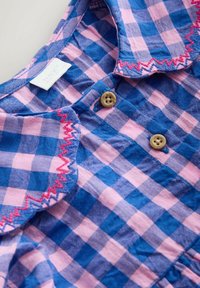 Ginghamjurk in blauw en roze met een knoopsluiting aan de voorkant, korte mouwen, een gegolfde kraag, twee zijzakken en een geborduurd hartdetail.