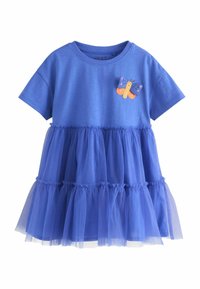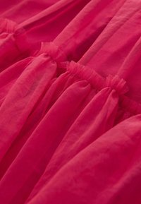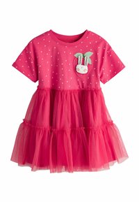Felroze peuterjurk met korte mouwen, witte stippen, gelaagde tule rok en een konijnenapplicatie met groene bladeren op de borst.