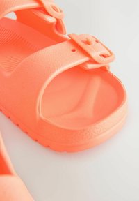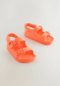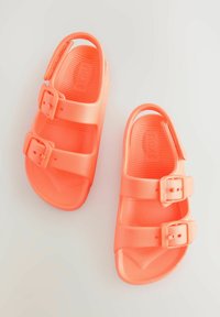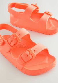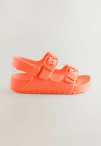 Felle oranje sandaal met twee verstelbare gespen aan de voorkant en een achterkantriem, met een gestructureerde zool, ontworpen voor dagelijks gebruik.