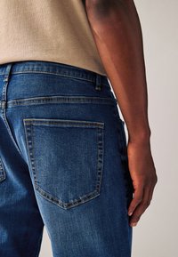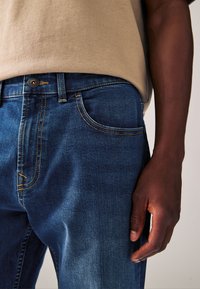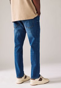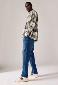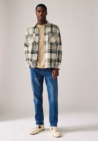 Man draagt beige t-shirt, beige en zwart geruite overshirt, blauwe jeans en beige sneakers, staand tegen een effen lichte achtergrond.
