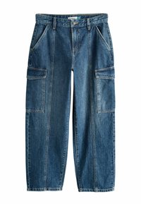 Rechtoe rechtaan blauwe denim cargo broek met twee zijvakjes, een knoopsluiting en zichtbare stikseldetails. Zachte textuur, casual ontwerp.