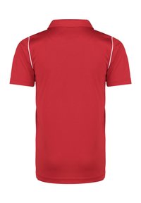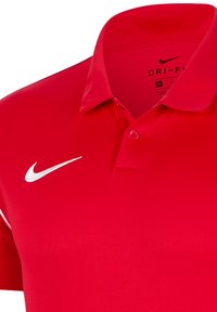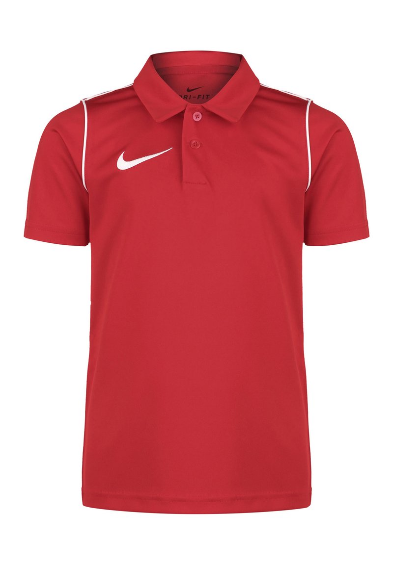 Rode Nike polo shirt met een kraag, drie knopen, witte accentstiksels en een wit logo op de linkerborst. Gemaakt van vochtafvoerende stof.