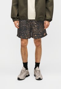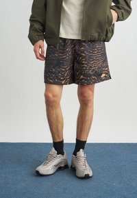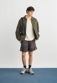 Man die zwarte en oranje korte Nike-broek met patroon draagt, een olijfgroen jack, beige sneakers en zwarte sokken en staat op een blauw tapijt.