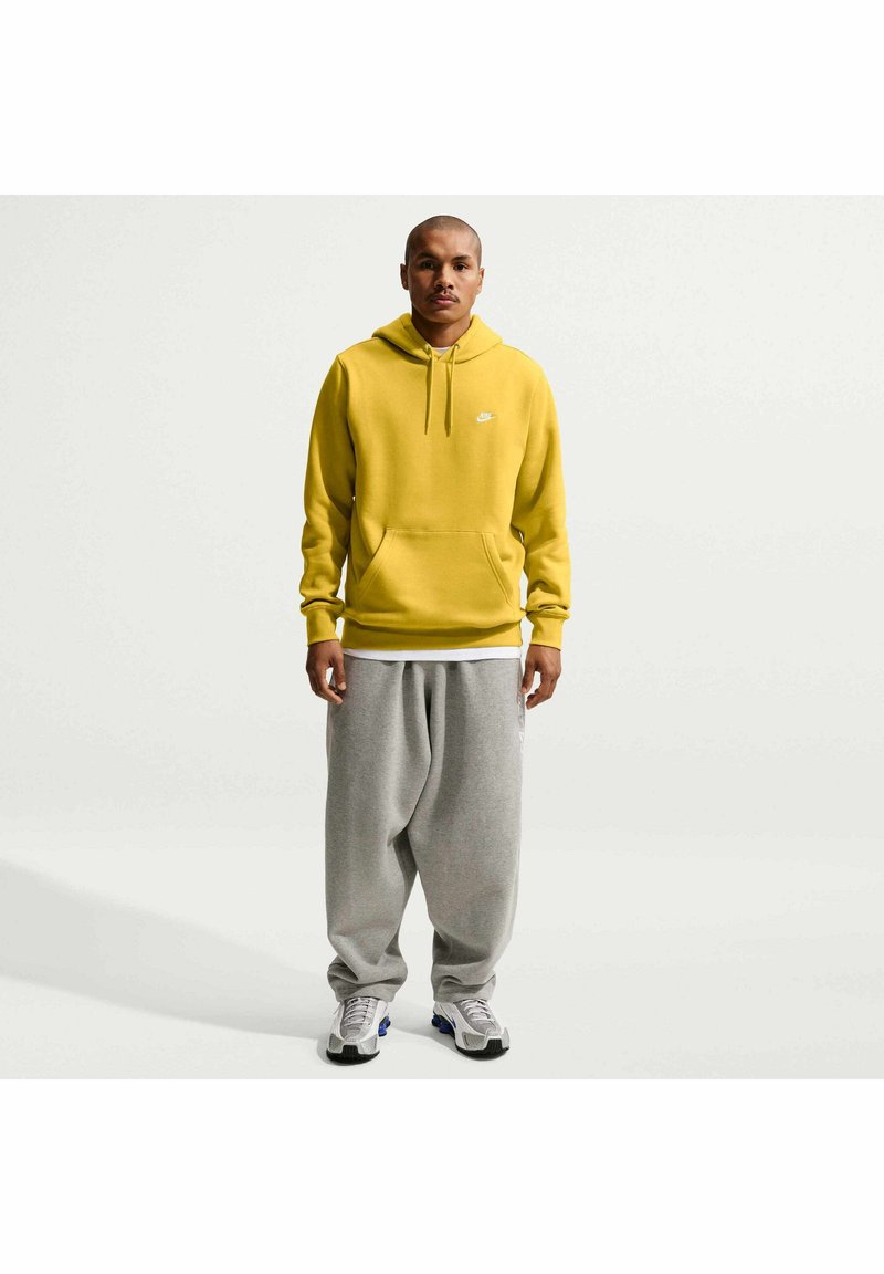 Man staat rechtop en draagt een gele Nike-hoodie, loszittende grijze joggingbroek en witte sneakers, kijkt recht vooruit tegen een effen witte achtergrond.
