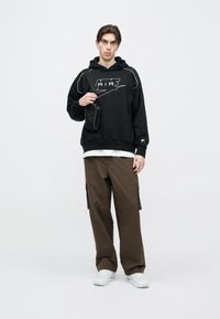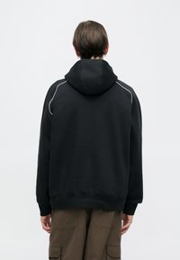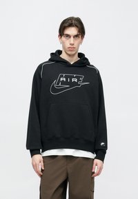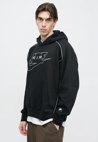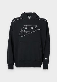 Zwarte hoodie met grijze accenten en het "AIR"-logo. Voorzien van een voorzak en geribbelde boordjes. Gemaakt van zacht materiaal, met een capuchon met trekkoord.