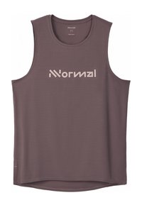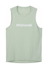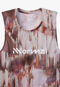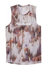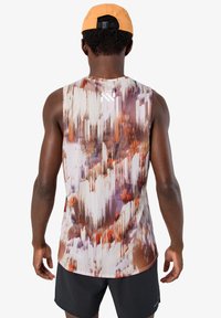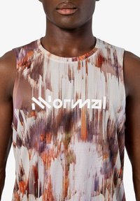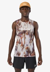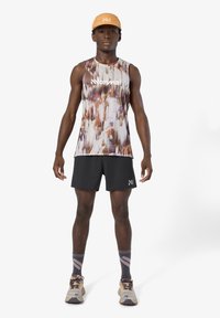 Jonge man draagt een mouwloos shirt met patroon, zwarte korte broek en een beige pet, staand tegen een effen lichte achtergrond.