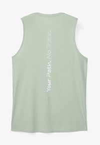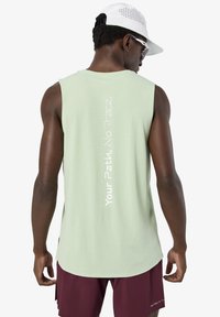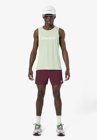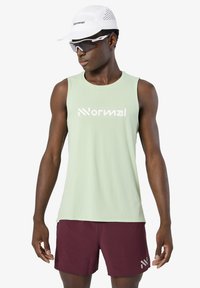 Man met lichtgroen mouwloos shirt met tekst "Nnormal", bordeauxrode korte broek, witte pet en witte sportzonnebril, staand tegen een effen achtergrond.