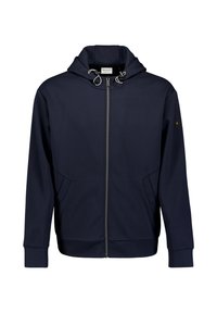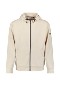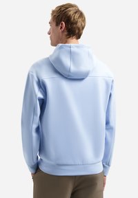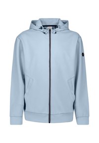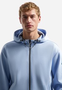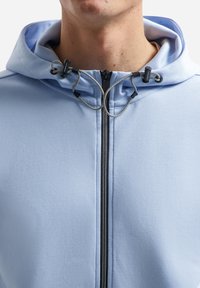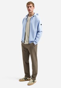 Man draagt een lichtblauwe hoodie met rits en trekkoorden en beige broek, staat met één hand in de zak tegen een effen achtergrond.