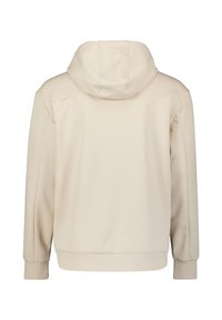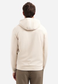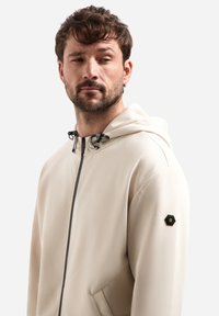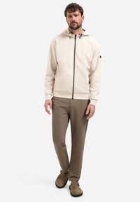 Man draagt een beige hoodie met ritssluiting en trekkoorden en bruine broek, staand tegen een effen witte achtergrond.