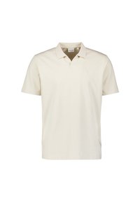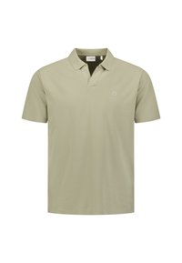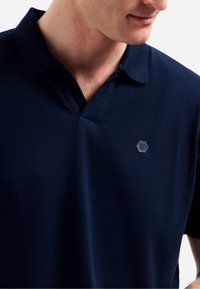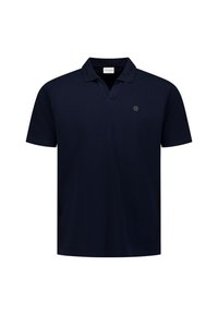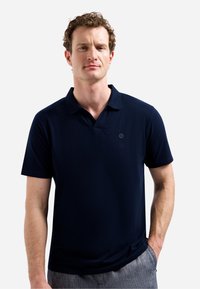 Man met krullend haar, gekleed in een marineblauw poloshirt met korte mouwen en grijze broek, met handen in de zakken, neutrale gezichtsuitdrukking, witte achtergrond.