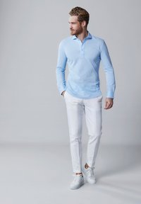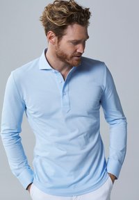 Lichtblauwe polo met lange mouwen, voorzien van een twee-knopen sluiting, zacht materiaal, slanke fit en vlakke kraag. Casual gedragen door een man.