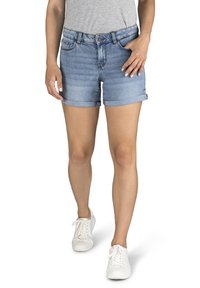 Denim shorts in lichtblauw en zwart, opgerolde uiteinden, klassieke pasvorm, vijf-pocket ontwerp, gecombineerd met witte sneakers op een grijze achtergrond.
