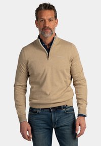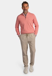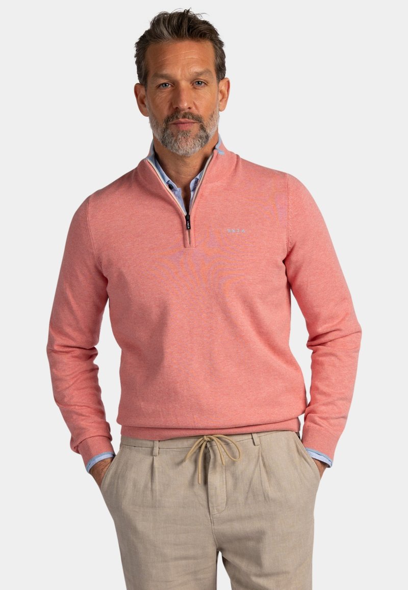 Man met grijze baard die een koraalkleurige trui met ritssluiting draagt over een blauw overhemd met kraag, beige broek, handen in de zakken, tegen een effen achtergrond.