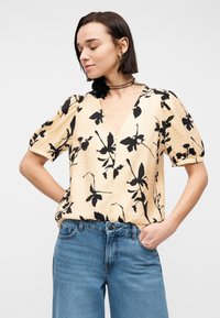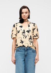 Vrouw draagt een beige blouse met zwart bloemenprint en pofmouwen, gecombineerd met een high-waisted blauwe jeans en een zwarte bloem choker.