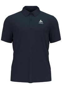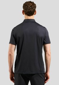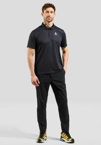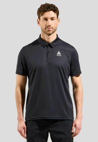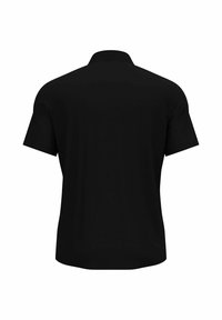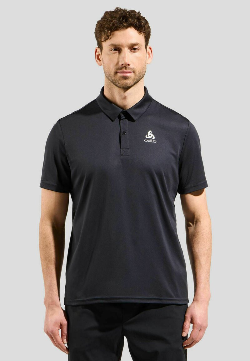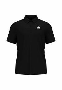Zwarte polo met een soepele stof, voorzien van een knoopsluiting bij de kraag, korte mouwen en een klein wit logo op de linkerborst.