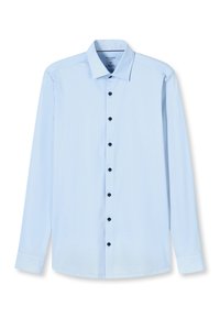 Man met kort krullend haar, gekleed in een nauwsluitend navy overhemd met lange mouwen en zwarte riem, staand met één hand in zijn zak.