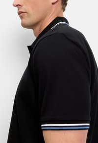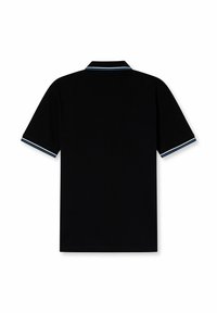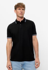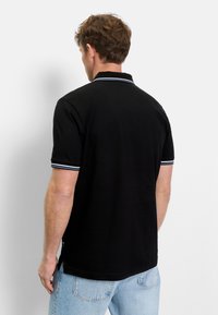 Man zit op een metalen stoel met een gevlochten zitting, draagt een zwart poloshirt, lichtblauwe spijkerbroek en witte sneakers tegen een effen witte achtergrond.