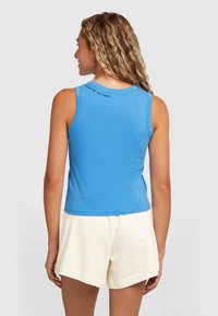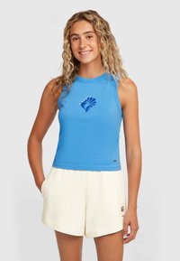 Blauw mouwloos topje met ronde hals, voorzien van een geborduurd ontwerp op de borst. Gecombineerd met crèmekleurige shorts met een logodetail.