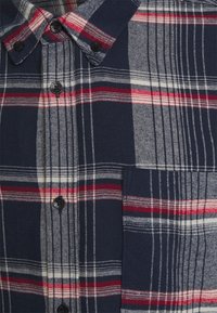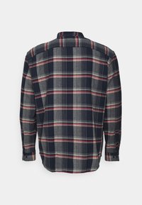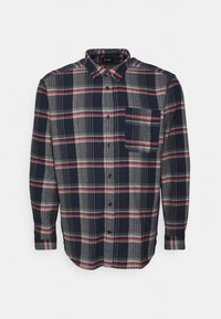 Marineblauw, grijs en rood geruit overhemd met knopen, lange mouwen, borstzak en knoopsluiting bij de kraag, afgebeeld op een witte achtergrond.