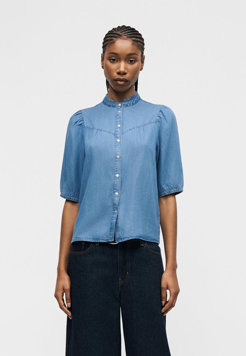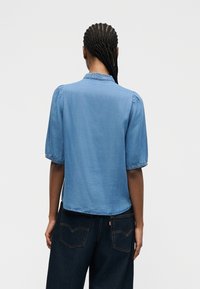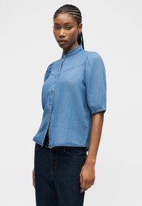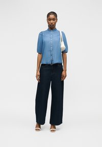Vrouw met gevlochten haar, gekleed in een lichtblauw blouse met knopen en opgeblazen mouwen, en donkerblauwe brede spijkerbroek.