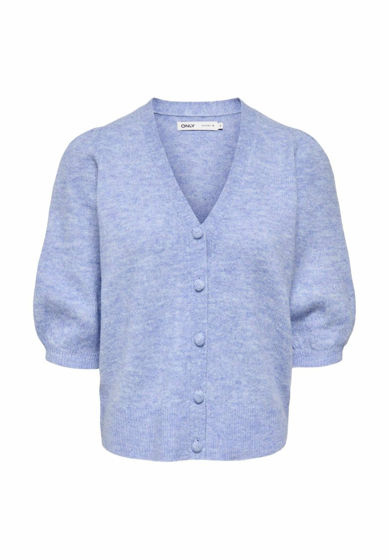 Lichtblauwe korte mouw cardigan met gewatteerde schouders, ronde knopen bedekt met stof aan de voorkant en een geribbelde zoom en manchetten.