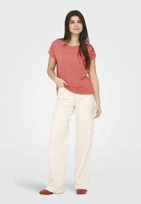 Koraalkleurig t-shirt met korte mouwen en een ronde halslijn, gemaakt van textuurstof. Gecombineerd met lichtbeige broeken, gepresenteerd op een neutrale achtergrond.