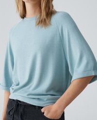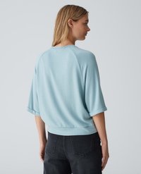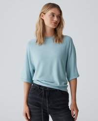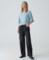 Lichtblauwe, losse trui met driekwartmouwen, zachte textuur, opgerolde manchetten, gedragen over donkere jeans met een aantrekkoord in de taille.