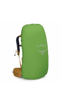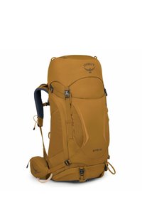 Grote Osprey Kyte 48 wandelrugzak in mosterdgeel met meerdere vakken en verstelbare riemen, voorkant zichtbaar tegen een witte achtergrond.