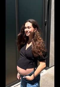 • Zwart wikkelshirt met korte mouwen, van een gestructureerde stof, gecombineerd met lichtblauwe brede jeans. Opvallend is een zichtbare zwangerschapsbuik en accessoires.