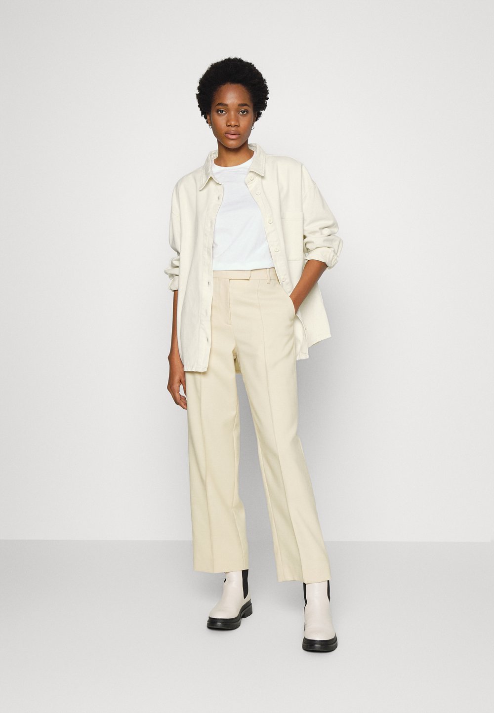 Persoon in een beige jasje, witte shirt en zwarte versleten cargo broek. Grijze tas met een gesp. Transparante brillen en witte sneakers.