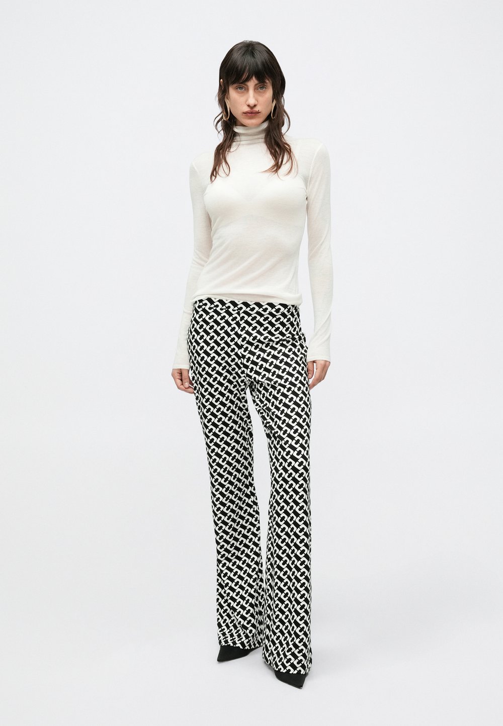 Denimjack met beige accenten en "EVISU" lettering, witte coltrui, brede blauwe jeans en schoenen in neutrale tonen voor een restaurant.