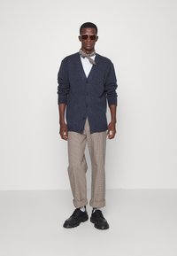 Grijze T-shirt met een donkergrijze trui over de schouders, gecombineerd met wijde donkerkleurige broeken en zwarte schoenen, tegen een textuurwand.