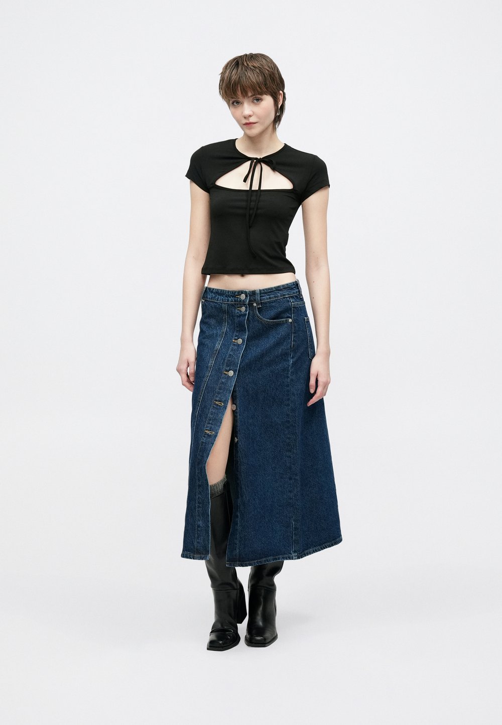 Zwarte crop top met uitgesneden ontwerp en korte mouwen, gecombineerd met losse zwarte shorts. Zilveren tas met een roze konijn charm, zwarte platform sandalen.