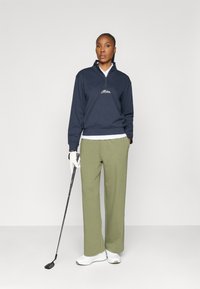Marineblauw en witte golfjas met een kraag, gecombineerd met een witte polo, beige shorts en witte schoenen, terwijl hij een golfclub vasthoudt. Gladde texturen.