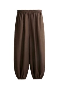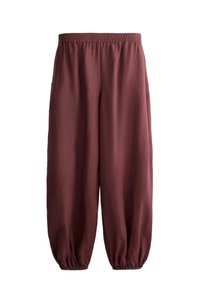 Vrouw die een wit mouwloos shirt en losse, roestkleurige broek met elastische taille draagt, staand met één hand in haar zak en zwarte sandalen.