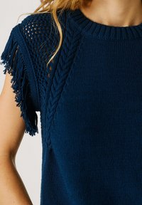 Vrouw met golvend blond haar, gekleed in een marineblauw gebreid mouwloos topje met franjes op de schouders en een witte broek, staand tegen een effen achtergrond.