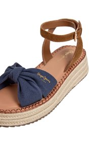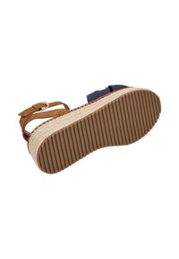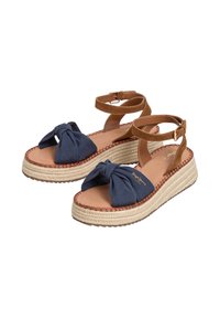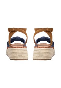 Bruine suède en marineblauwe stoffen sandaal met enkelbandje, een gevlochten plateauzool en een gesp sluiting.