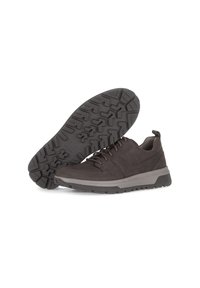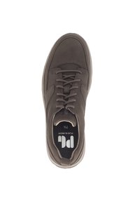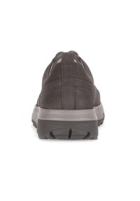 Donkergrijze sportchoenen van suède, met een gestructureerd oppervlak, ronde neus, vetersluiting aan de voorkant en een dikke rubberen zool met een lichte hak.