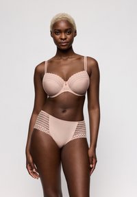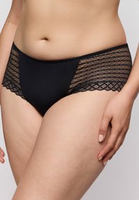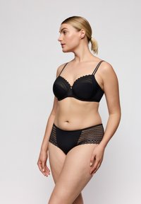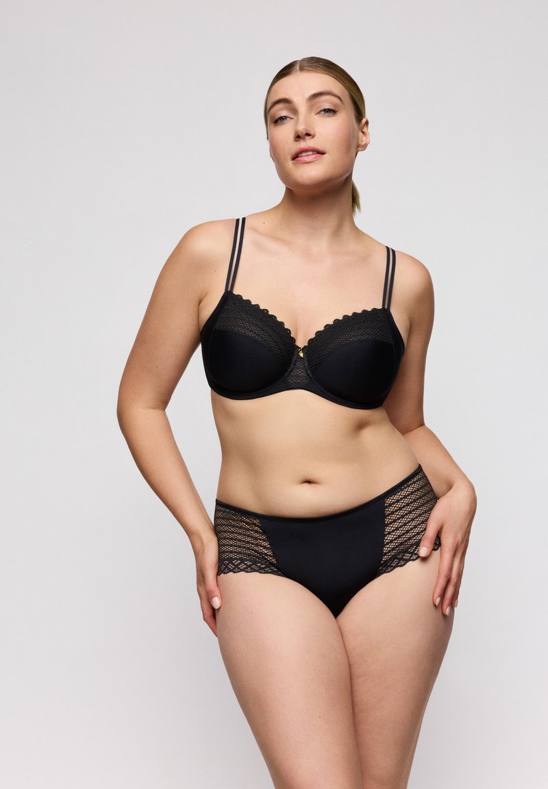 Vrouw poseert in zwart kanten beha met dubbele bandjes en bijpassende kanten zijden slip tegen een effen achtergrond.