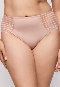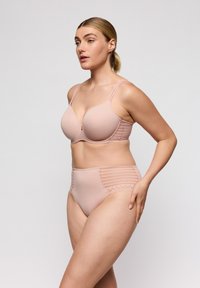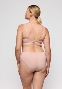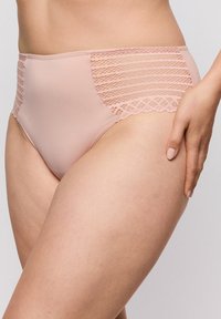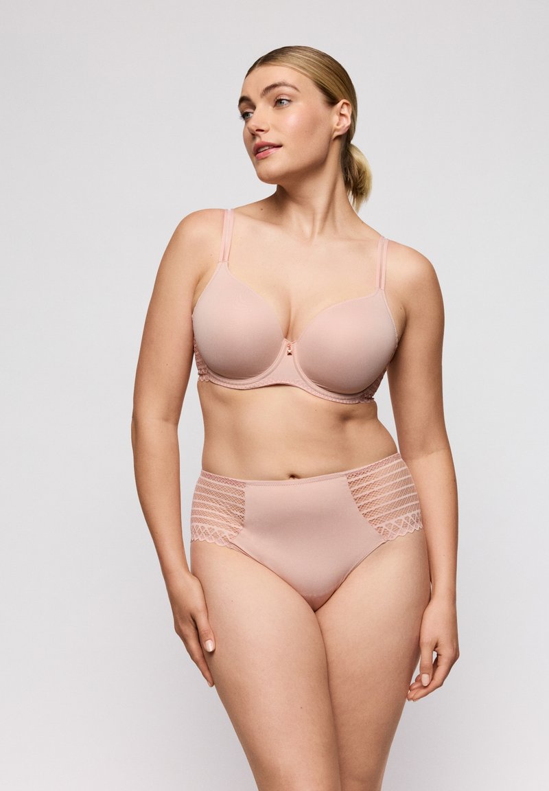 Vrouw die een lichtroze beha en bijpassende hoge slipjes met kanten rand draagt, kijkt iets naar links tegen een effen achtergrond.