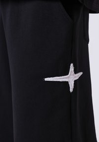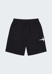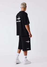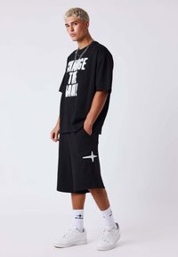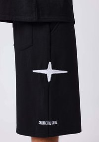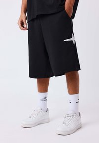 Man draagt zwarte kniebroek met wit kruisontwerp, witte sokken met zwart logo en witte sneakers, staat met één hand in de zak.