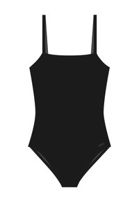 Blauwe one-piece zwempak met dunne banden, een vierkante halslijn en een hooggesneden beenontwerp. Zachte textuur, geen patronen of opvallende accenten.