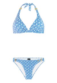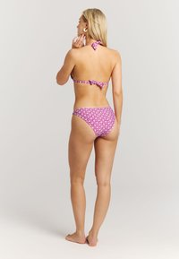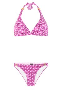 Roze bikini met bloemenpatroon, voorzien van een triangel top met halternek en een bijpassende broek met lage taille en gouden accenten.